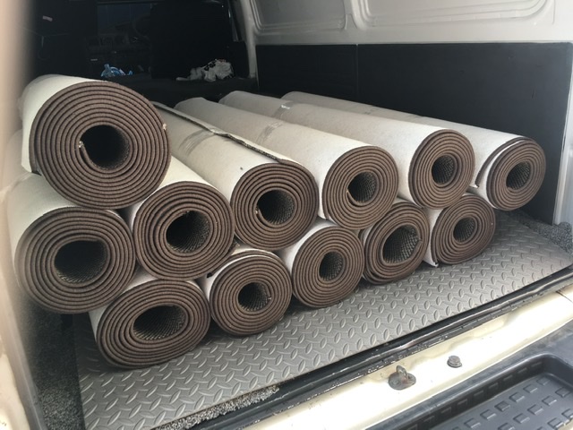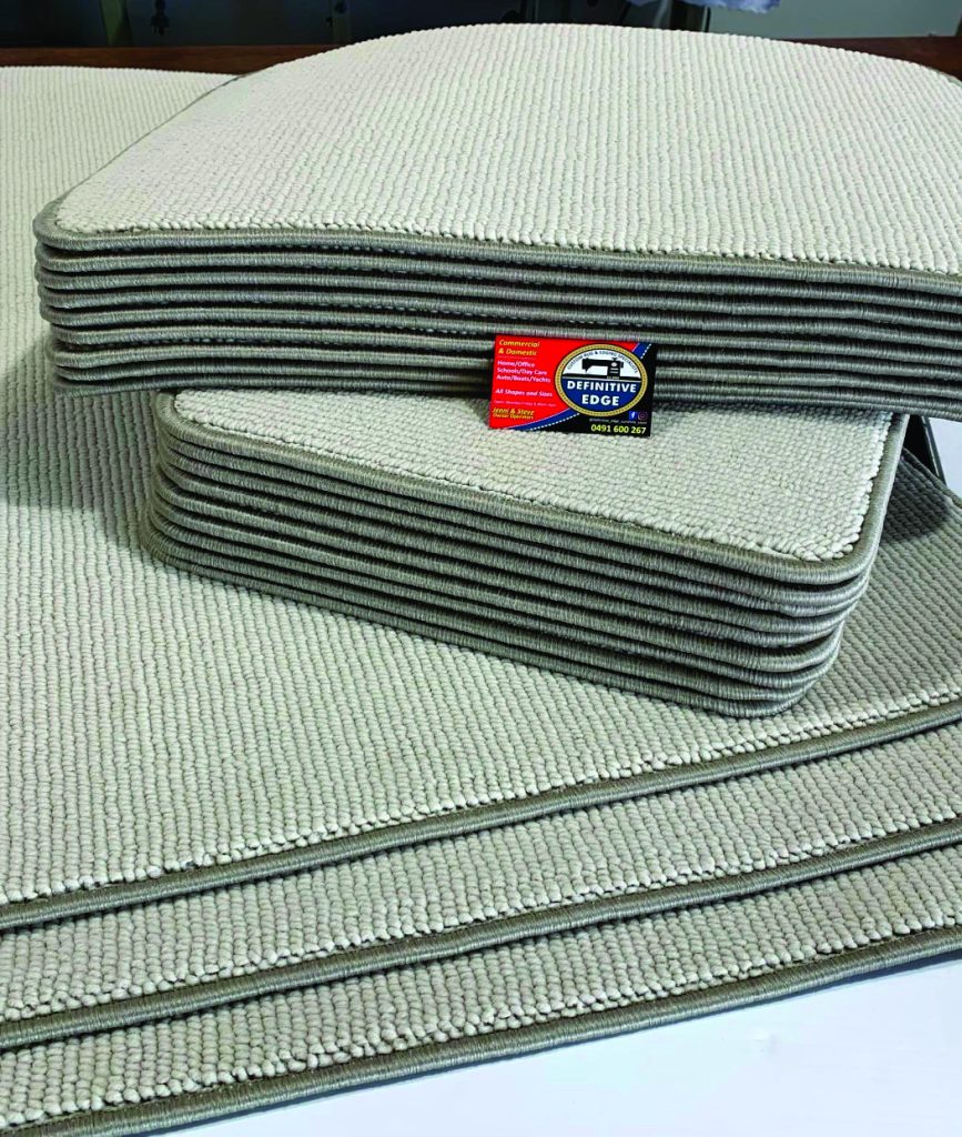 Overlocking machines can take up to a 12mm thick carpet, we can add backings like comfort foam or calico, we sew it into the edges whilst overlocking – it locks it in tight.